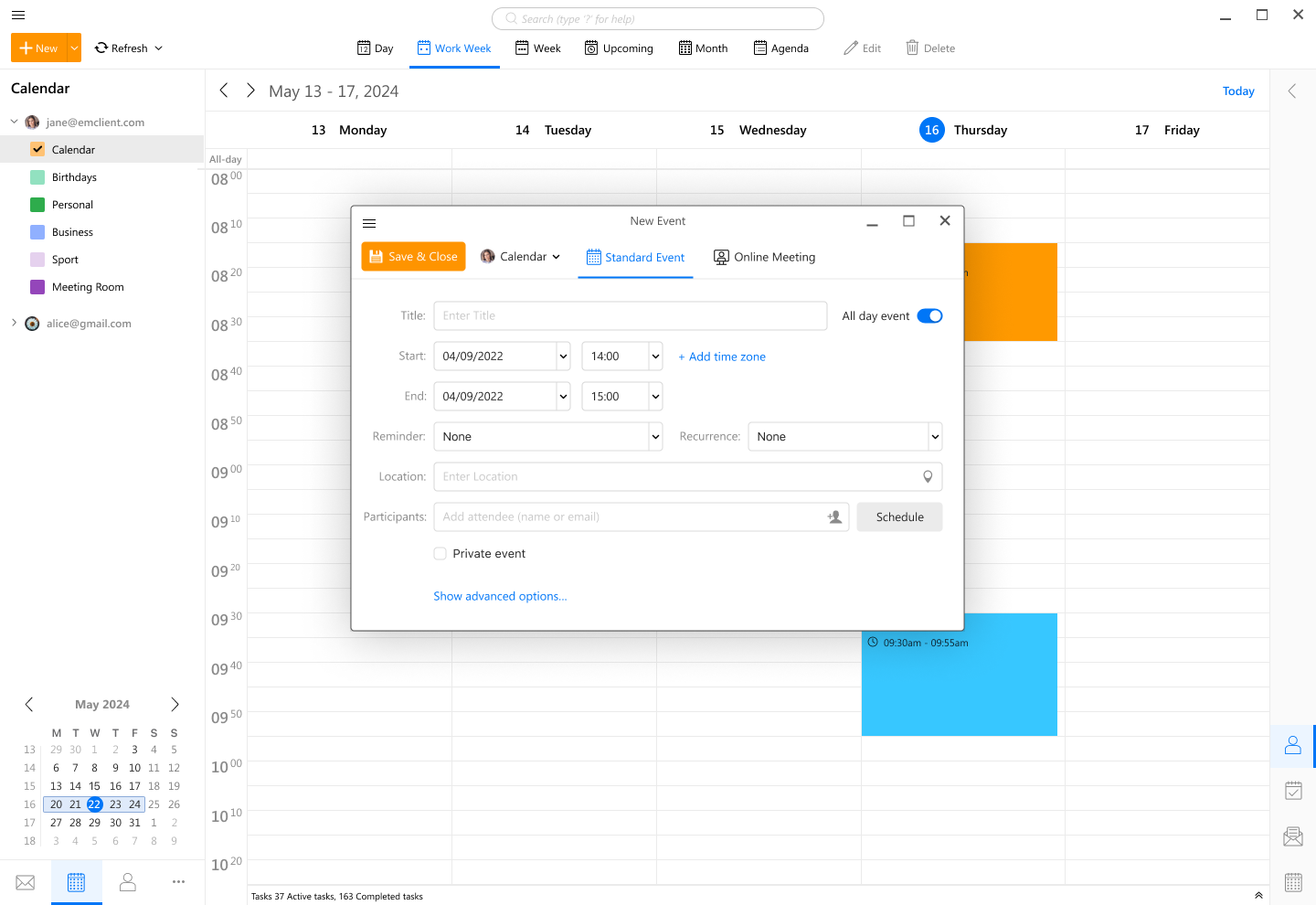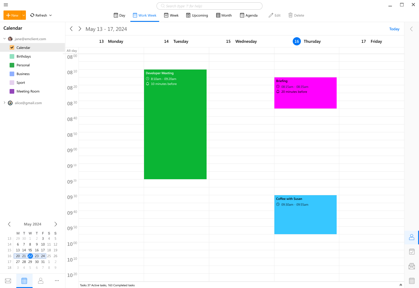 eM Clientのカレンダーとタスク機能は予定管理を強力にサポートします。 あらゆるサービス(Gmail、iCloudなど)からカレンダーとタスクを同期し、eM Client の見やすい画面で管理することができます。
