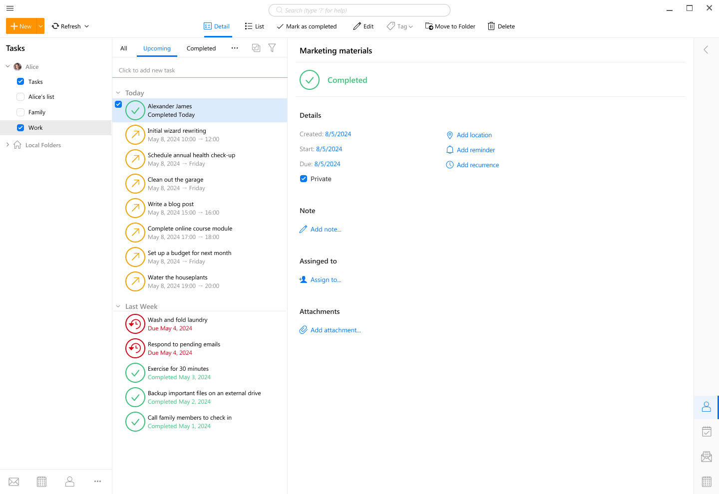 アプリケーション全体を通してタスクを表示・管理します。すべてのデバイスでのタスクを同期、同僚へのタスクのアサイン、リマインダーの設定、タグによるタスクの整理なども可能。「GTD(Getting Things Done)」の理論に基づいた新しいビューによって、すべてのタスクを効率よく管理することができます。