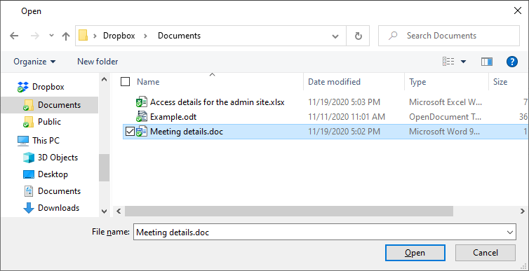 • Dropbox がすでにパソコンにインストールされている場合、eM Clientは自動的に Dropbox を検出します。また、アプリがインストールされている状態で、クラウドストレージフォルダからファイルをドラッグ&ドロップまたは選択すると、Dropbox ストレージとeM Clientの接続を案内します。