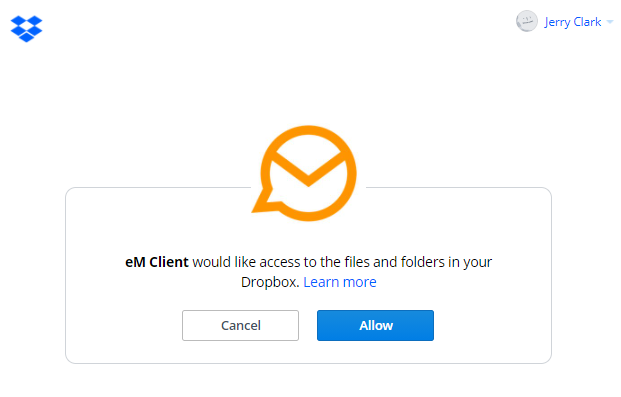4. Dropbox のファイルフォルダにeM Clientがアクセスできるようにするための画面が表示されます。この許可は初回のみ必要です。