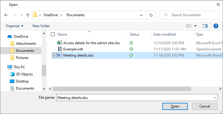 OneDrive がすでにパソコンにインストールされている場合、eM Clientは自動的に OneDrive を検出します。また、アプリがインストールされている状態で、クラウドストレージフォルダからファイルをドラッグ&ドロップまたは選択すると、OneDrive ストレージとeM Clientの接続を案内します。