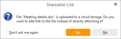 ダイアログが開き、ファイルを物理的に添付するのではなく、リンクさせるかどうかを選択することができます。ファイルをリンクさせるには「はい」をクリックします。クラウドストレージにアップロードされたファイルをリンクとしてのみ添付するよう設定することもできます。
