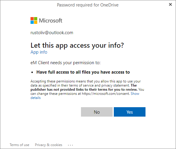 eM Client が OneDrive のファイルフォルダにアクセスできるよう許可します。